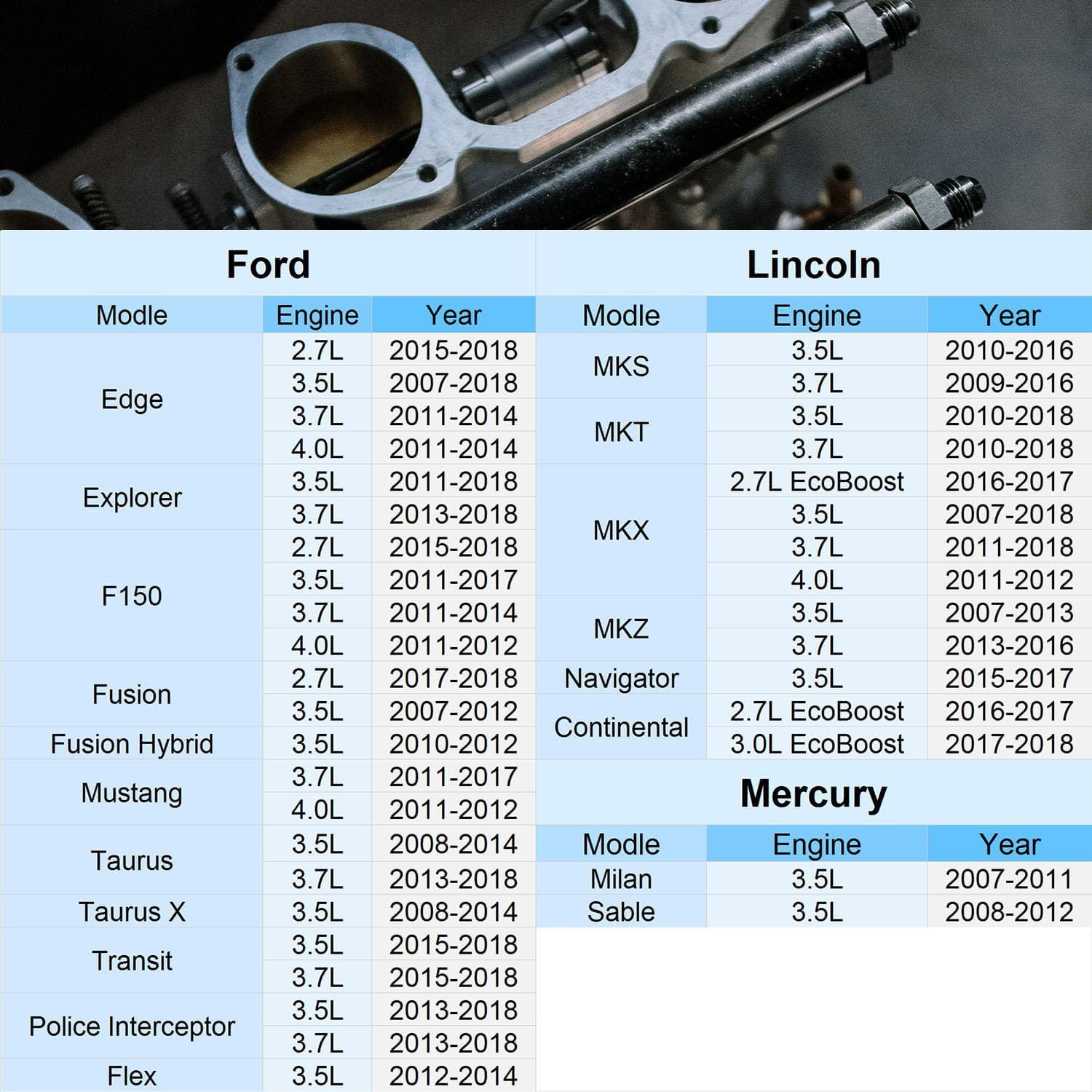 1. ACCESORIOS PARA VEHÍCULOS: Funciona para motores 3.5L y 3.7L 4V. Utilizado en vehículos: Ford Edge, Explorer, F-150, MKX, MKT, MKZ, Mustang, Flex, Fusion Hybrid, Milan, Sable, Taurus, Taurus X. Confirme amablemente más detalles de compatibilidad en las descripciones de productos a continuación antes de la compra.