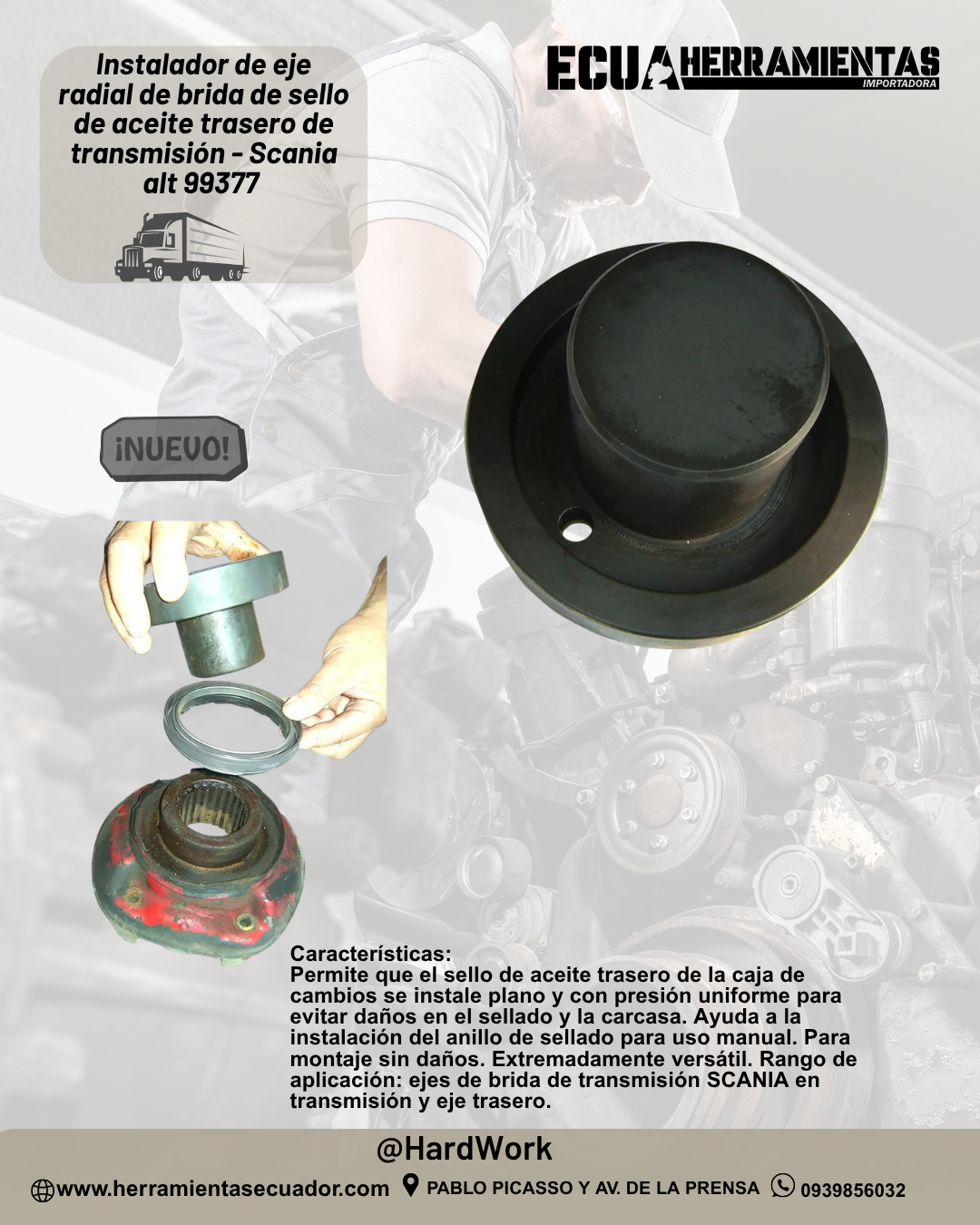 - Permite que el sello de aceite trasero de la caja de cambios se instale plano y con presión uniforme para evitar daños en el sellado y la carcasa. Ayuda a la instalación del anillo de sellado para uso manual. Para montaje sin daños. Extremadamente versátil. Rango de aplicación: ejes de brida de transmisión SCANIA en transmisión y eje trasero (p. ej. cambiar a Simmerrings (sello del eje radial) número de parte. 1 502 384 / 1 502 385).