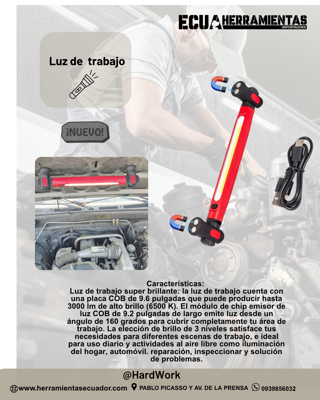 - Imanes fuertes y ganchos giratorios: hay 2 potentes imanes en cada extremo de la luz de trabajo magnética, ideal para fijar en la parte inferior del capó o superficie metálica magnética (no se adhiere al aluminio). El gancho giratorio oculto puede colgar la luz mecánica en el gancho/cuerda/cadena sobre tu área de trabajo. Además, las bases pueden girar 180° y la parte de iluminación central puede girar 360° para emitir la luz donde quieras que vaya.